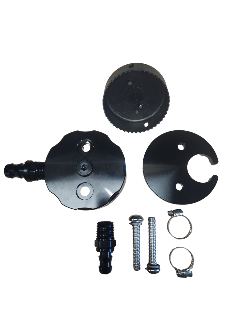 Easy install two bolt design. Great for high flow lift pumps from Airdog, FASS, etc for Cummins. Sump is CNC machined and anodized Black. Inner ring is easy to mount and fits through a 3" hole made with hole saw. O-Ring seal for a good durable seal. Includes stainless steel hardware and 1x brass 1/2" barb fittings and drain plug, and 3" Hole Saw. Needs 4" diameter flat area on the fuel tank, metal or plastic, to be installed.